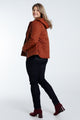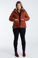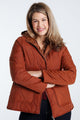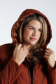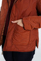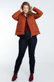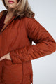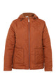 Korte, effen donsjas met grote zakken, kap, rits en stiksels